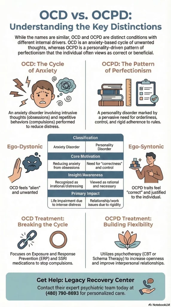 OCD is an anxiety-driven disorder of unwanted thoughts, while OCPD is a personality style centered on control and perfection. As such, the treatments are different.